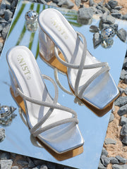 GNIST Silver Embellished Cross Strap Block Heel